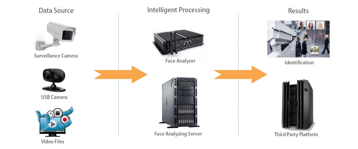 Intelligent processing of data source can be completed through the human face analyzer or the human face analyzing server. The human face analyzer, an embedded device, ensures the access of four high-definition cameras at the same time, and its DB capacity reaches 100,000 faces. The human face analyzer is pre-installed with the multi-face analyzing software. Both the number of cameras supported and the DB capacity depend on the server’s performance. Over 10 million faces can be stored and large-scale cameras are supported.